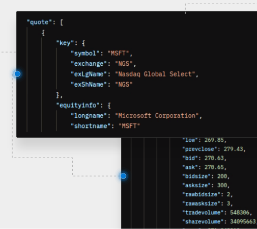 We also deliver market data and research in our JSON Financial Data APIs. This allows you to easily integrate our data into your web products. For javascript developers, JSON is natively supported and pluggable into AJAX for dynamically updating HTML5 applications.  Read More