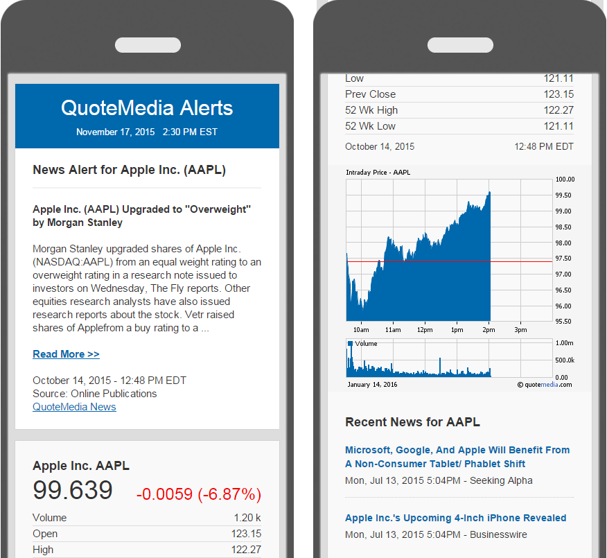 You can add a custom version of QuoteMedia's News Alerts Service to your website or application and allow your users to select the companies they wish to track. Users can receive custom alerts for news stories, press releases, and even new company filings, from a wide range of global sources.