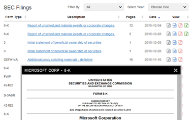 SEC Filings content is available in QuoteMedia's XML and JSON services, and in all Web Content Solutions and Applications.
