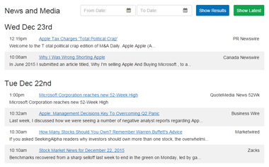 QuoteMedia aggregates news, press releases and online content (portals, web content, finance blogs, etc.) from over 300 sources, and we are always adding new content and products. News content is available within QuoteMedia's XML and JSON services, and in all Web Content Solutions and Applications.